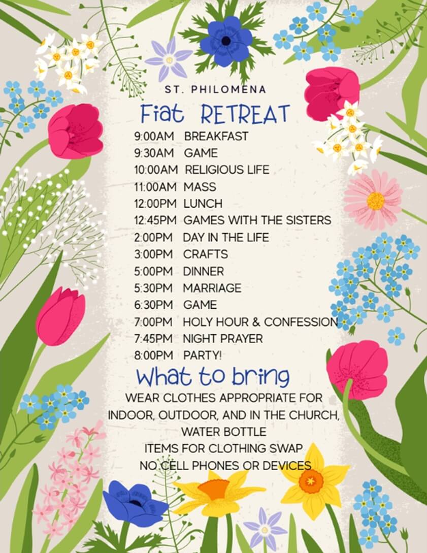 CLICK HERE for the registration form for our Fiat Retreat for girls going in to 6th, 7th or 8th grades in the fall of 2026.